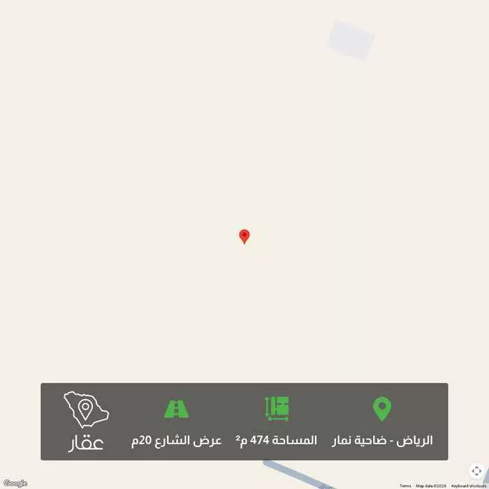474 م² أرض في ضاحية نمار، الرياض معروضة بسعر ٦٥١٬١٠٢ ريال، أقل بنسبة 13% من متوسط سعر الحي البالغ ٧٥٠٬٠٠٠ ريال. بناءً على 439 عقار مشابه.
