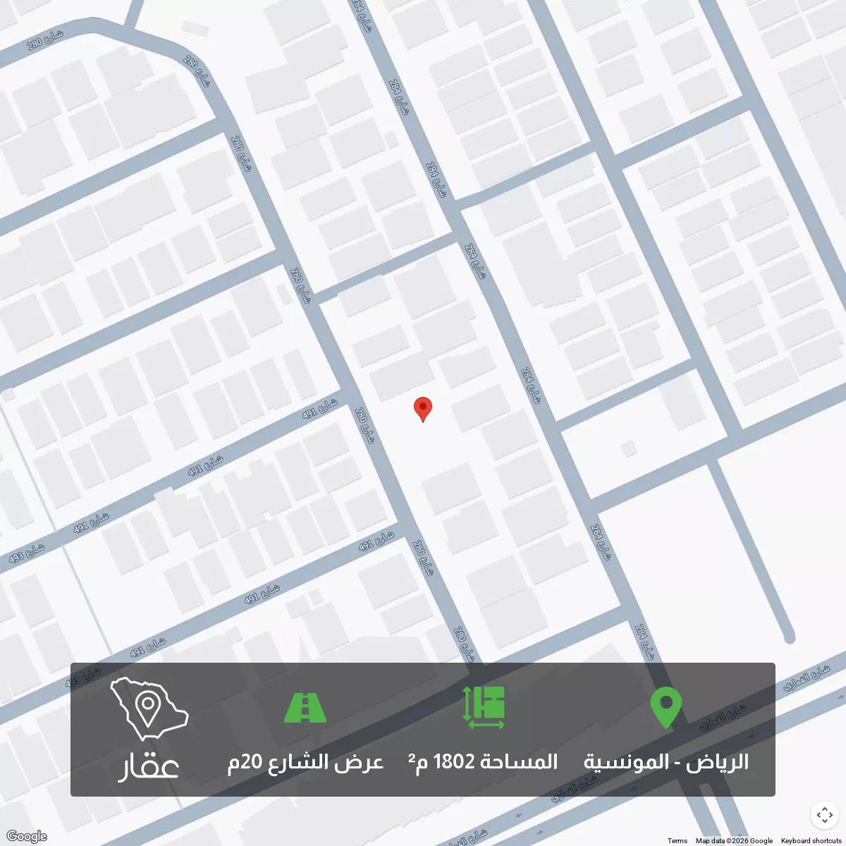 عرض على Aqarأرض حي المونسية – مساحة 1802.4 م2 | للبيع – الرياض فرصة مميزة لامتلاك أرض سكنية في موقع راقٍ داخل حي المونسية مناسبة للسكن العائلي وخيار مثالي للمطورين العقاريين عرض الشارع: 20 متر الواجهة: غربية المو...