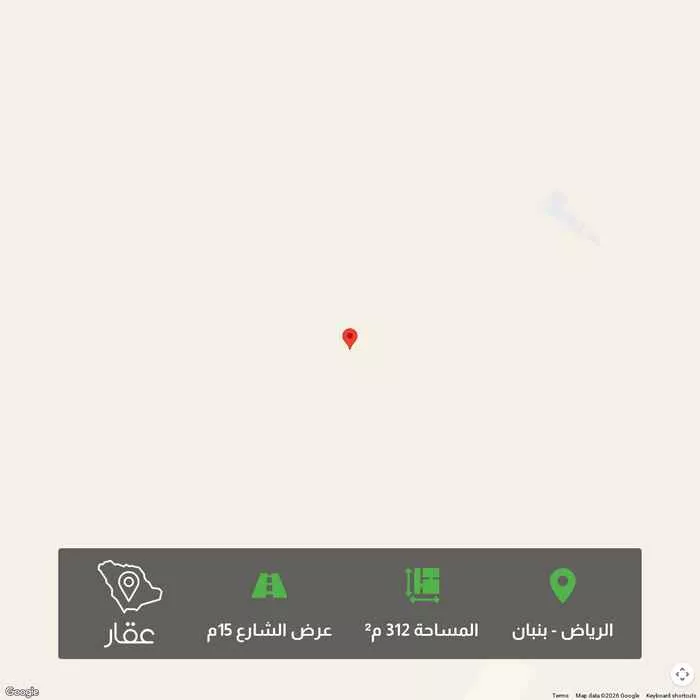 312 م² أرض في بنبان، الرياض معروضة بسعر ٥٤٦٬٠٠٠ ريال، أقل بنسبة 61% من متوسط سعر الحي البالغ ١٬٤٠٠٬٠٠٠ ريال. بناءً على 32 عقار مشابه.