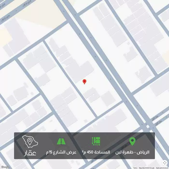 450 م² أرض في ظهرة لبن، الرياض معروضة بسعر ١٬٤٥٠٬٠٠٠ ريال، أقل بنسبة 41% من متوسط سعر الحي البالغ ٢٬٤٧٥٬٠٠٠ ريال. بناءً على 266 عقار مشابه.