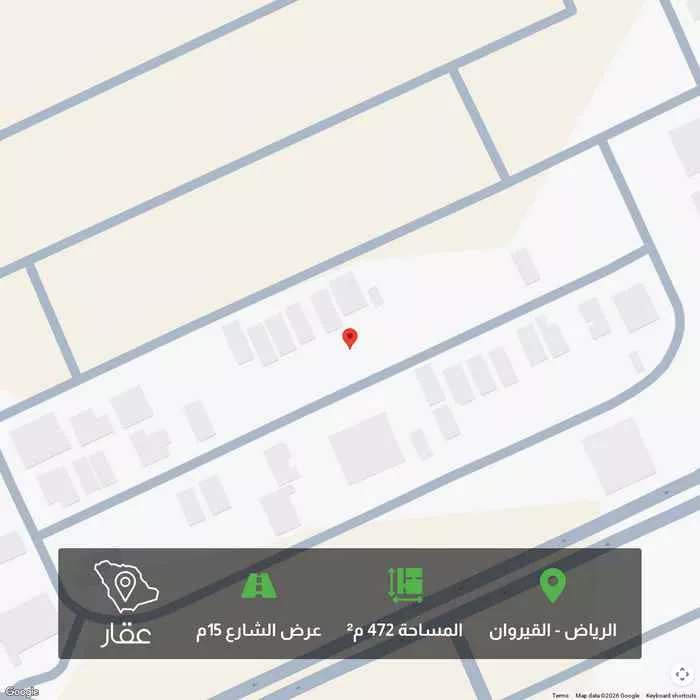 472 م² أرض في القيروان، الرياض معروضة بسعر ٤٬٠١٦٬٢٥٠ ريال، أعلى بنسبة 19% من متوسط سعر الحي البالغ ٣٬٣٧٥٬٠٠٠ ريال. بناءً على 212 عقار مشابه.