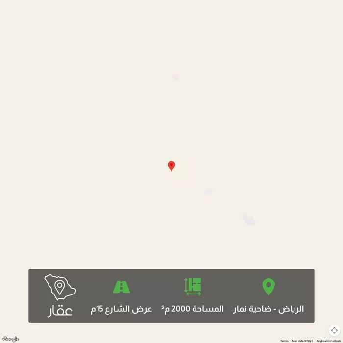 2000 م² أرض في ضاحية نمار، الرياض معروضة بسعر ٣٬٣٠٠٬٠٠٠ ريال، أعلى بنسبة 340% من متوسط سعر الحي البالغ ٧٥٠٬٠٠٠ ريال. بناءً على 439 عقار مشابه.
