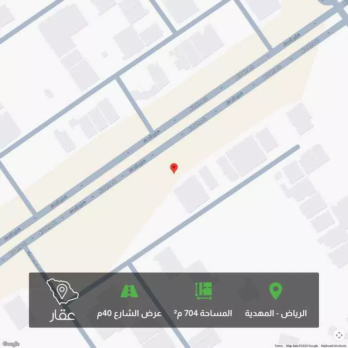704 م² أرض في المهدية، الرياض معروضة بسعر ٣٬٩٤٢٬٤٠٠ ريال، أعلى بنسبة 114% من متوسط سعر الحي البالغ ١٬٨٣٩٬٨٤٠ ريال. بناءً على 364 عقار مشابه.