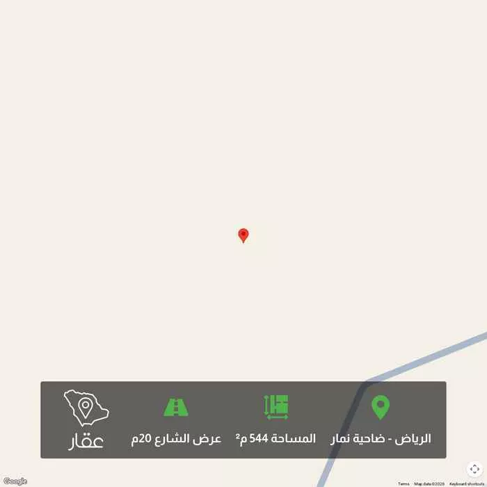 544 م² أرض في ضاحية نمار، الرياض معروضة بسعر ٦٢٥٬٦٥٧ ريال، أقل بنسبة 17% من متوسط سعر الحي البالغ ٧٥٠٬٠٠٠ ريال. بناءً على 439 عقار مشابه.