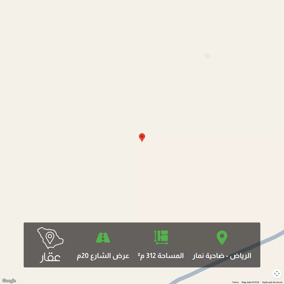312 م² أرض في ضاحية نمار، الرياض معروضة بسعر ٣٢٩٬٤٧٢ ريال، أقل بنسبة 57% من متوسط سعر الحي البالغ ٧٦٣٬٨٠٠ ريال. بناءً على 30 عقار مشابه.