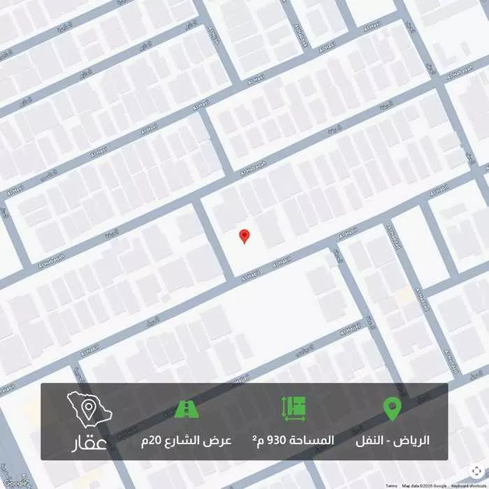 930 م² أرض في النفل، الرياض معروضة بسعر ١٥٬٠٠٠٬٩٠٠ ريال، أعلى بنسبة 308% من متوسط سعر الحي البالغ ٣٬٦٧٥٬٥٠٠ ريال. بناءً على 10 عقار مشابه.