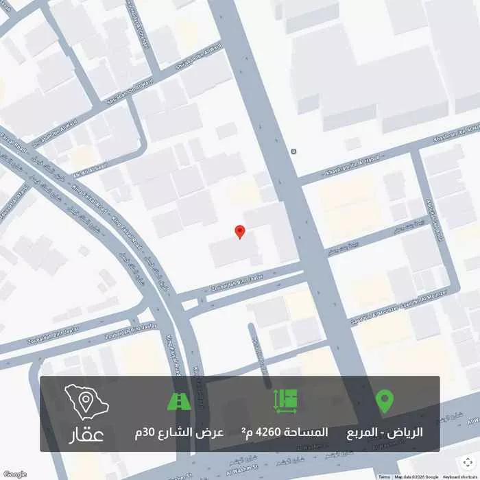 عرض على Aqarللبيع أرض تجارية استثمارية مميزة في حي المربع مساحة 4261 م²، رأس بلك على 3 شوارع حيوية وتجارية : • غربًا: شارع الملك فيصل (عرض 40 م، طول 58 م) • شرقًا: شارع (الضباب) (طول 49 م) • جنوبًا: شارع زبيدة بن...