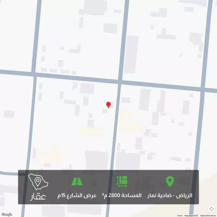 2800 م² أرض في ضاحية نمار، الرياض معروضة بسعر ١٬١٢٠٬٠٠٠ ريال، أعلى بنسبة 49% من متوسط سعر الحي البالغ ٧٥٠٬٠٠٠ ريال. بناءً على 439 عقار مشابه.