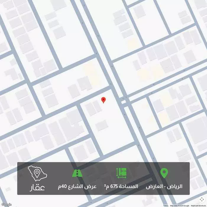 عرض على Aqarأرض للبيع بحي العارض شمال الرياض الشارع الوحيد بعرض 40م في منطقة العــارض المساحة 675 متر مربع رقم القطعة 433 من المخطط رقم 2078/أب شمالا شارع عرض 20 متر بطول 27 متر جنوبا قطعة رقم 431 بطول 27 متر شرق...