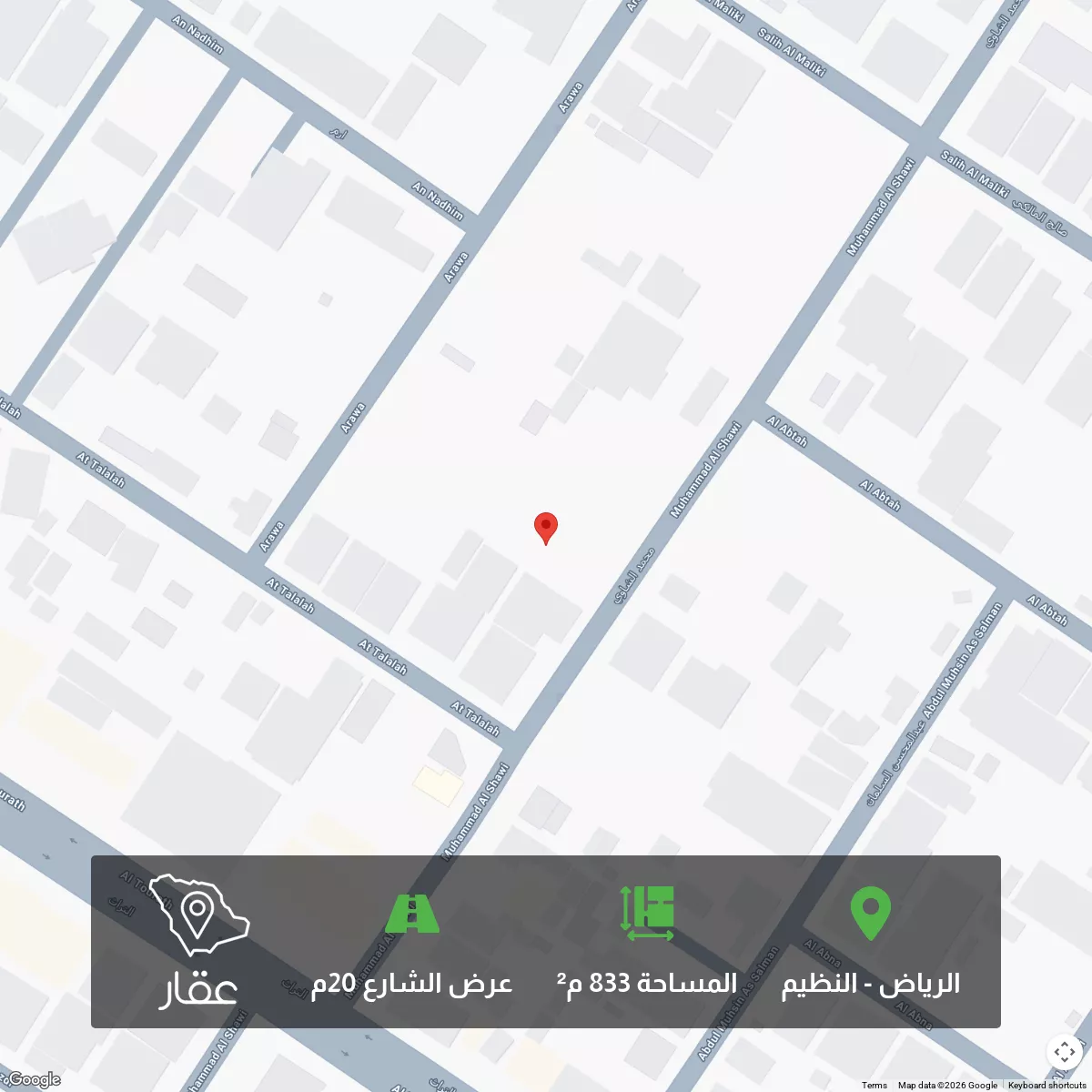 عرض على Aqarارض شارع 20 جنوبي مساحتها 833.35 طولها على الشارع 16.67 والعمق 50 السوم مليون وخمسمائة الف صافي غير شامل السعى والضريبة
