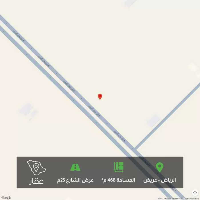 468 م² أرض في عريض، الرياض معروضة بسعر ٦٬٦٧٢ ريال، أقل بنسبة 98% من متوسط سعر الحي البالغ ٣٩٩٬٦٠٠ ريال. بناءً على 653 عقار مشابه.