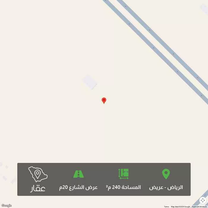240 م² أرض في عريض، الرياض معروضة بسعر ١٨٬٠٠٠ ريال، أقل بنسبة 95% من متوسط سعر الحي البالغ ٣٩٩٬٦٠٠ ريال. بناءً على 653 عقار مشابه.