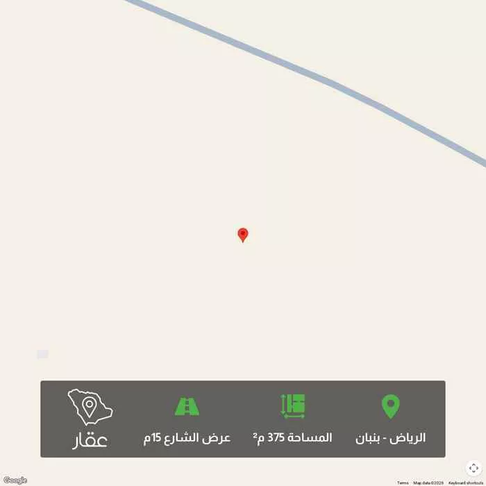 375 م² أرض في بنبان، الرياض معروضة بسعر ٢٠٬٤٠٠ ريال، أقل بنسبة 97% من متوسط سعر الحي البالغ ٨٠٤٬٥٦٢٫٥ ريال. بناءً على 944 عقار مشابه.