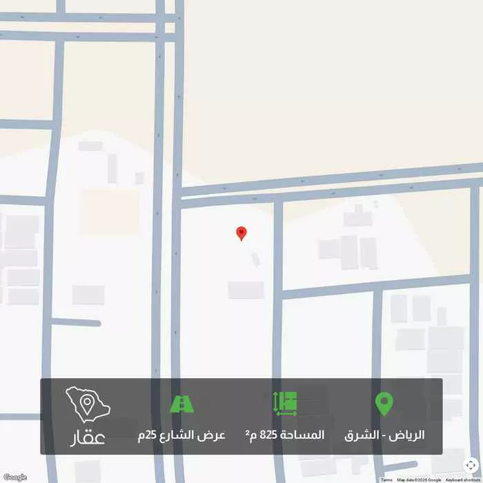 825 م² أرض في الشرق، الرياض معروضة بسعر ٣٩٬٦٠٠ ريال، أقل بنسبة 93% من متوسط سعر الحي البالغ ٥٩٨٬٩٥٠ ريال. بناءً على 650 عقار مشابه.