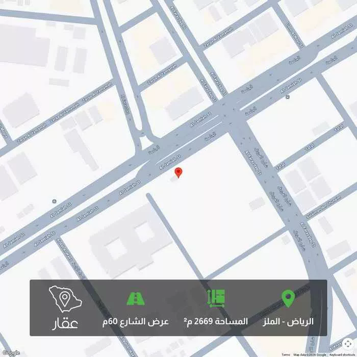2669 م² أرض في الملز، الرياض معروضة بسعر ١٬٢٠٠٬٠٠٠ ريال، أقل بنسبة 31% من متوسط سعر الحي البالغ ١٬٧٣٨٬٨٠٠ ريال. بناءً على 31 عقار مشابه.