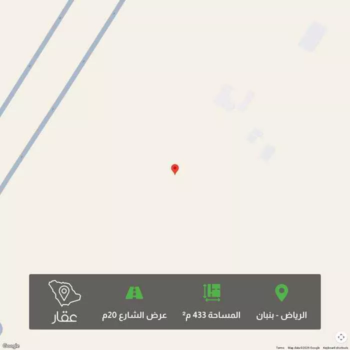 433 م² أرض في بنبان، الرياض معروضة بسعر ٢٤٬٠٠٠ ريال، أقل بنسبة 97% من متوسط سعر الحي البالغ ٨٠٤٬٥٦٢٫٥ ريال. بناءً على 944 عقار مشابه.