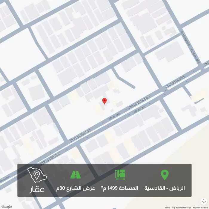 1499 م² أرض في القادسية، الرياض معروضة بسعر ٥٤٬٠٠٠ ريال، أقل بنسبة 98% من متوسط سعر الحي البالغ ٢٬٩٧٥٬٠٠٠ ريال. بناءً على 47 عقار مشابه.