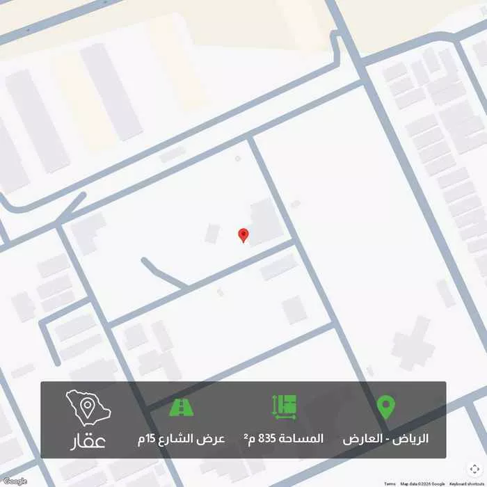 835 م² أرض في العارض، الرياض معروضة بسعر ٧٢٬٠٠٠ ريال، أقل بنسبة 98% من متوسط سعر الحي البالغ ٣٬٢٤٥٬٨٢٤ ريال. بناءً على 361 عقار مشابه.