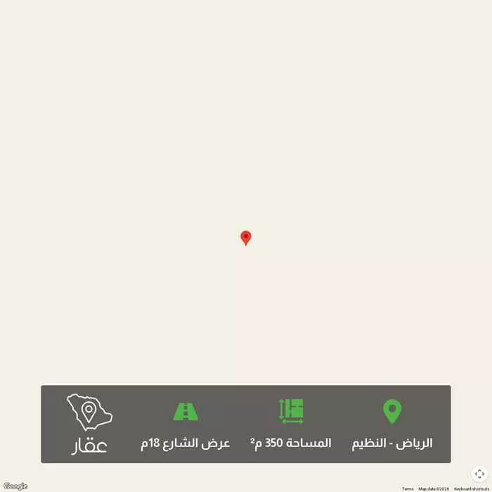 350 م² أرض في النظيم، الرياض معروضة بسعر ١٨٬٠٠٠ ريال، أقل بنسبة 98% من متوسط سعر الحي البالغ ٧٥٣٬٠٠٠ ريال. بناءً على 228 عقار مشابه.