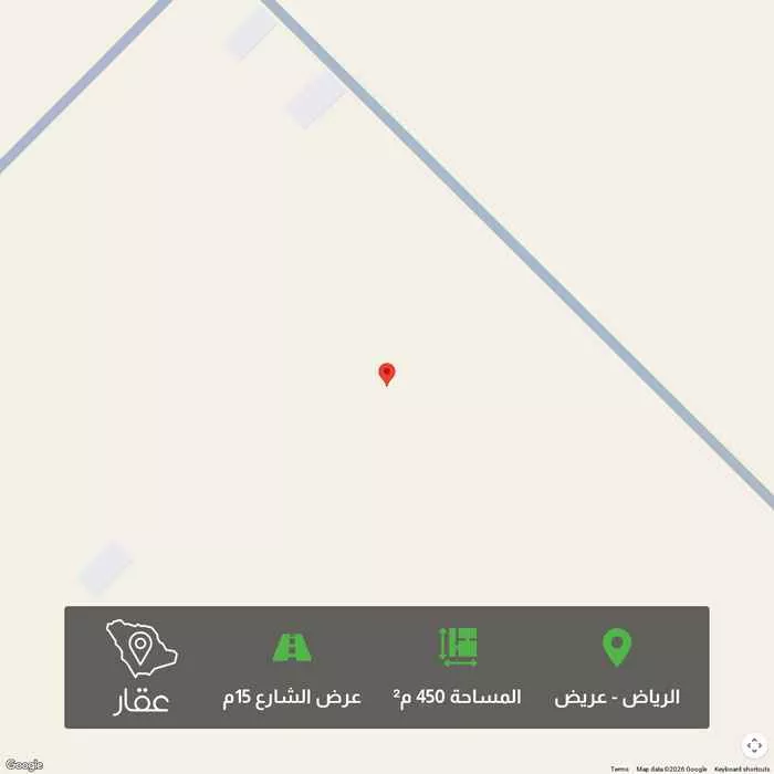 450 م² أرض في عريض، الرياض معروضة بسعر ٤٬٢٠٠ ريال، أقل بنسبة 99% من متوسط سعر الحي البالغ ٣٩٩٬٦٠٠ ريال. بناءً على 653 عقار مشابه.