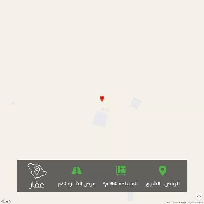 960 م² أرض في الشرق، الرياض معروضة بسعر ١٢٠ ريال، أقل بنسبة 100% من متوسط سعر الحي البالغ ٥٩٨٬٩٥٠ ريال. بناءً على 650 عقار مشابه.