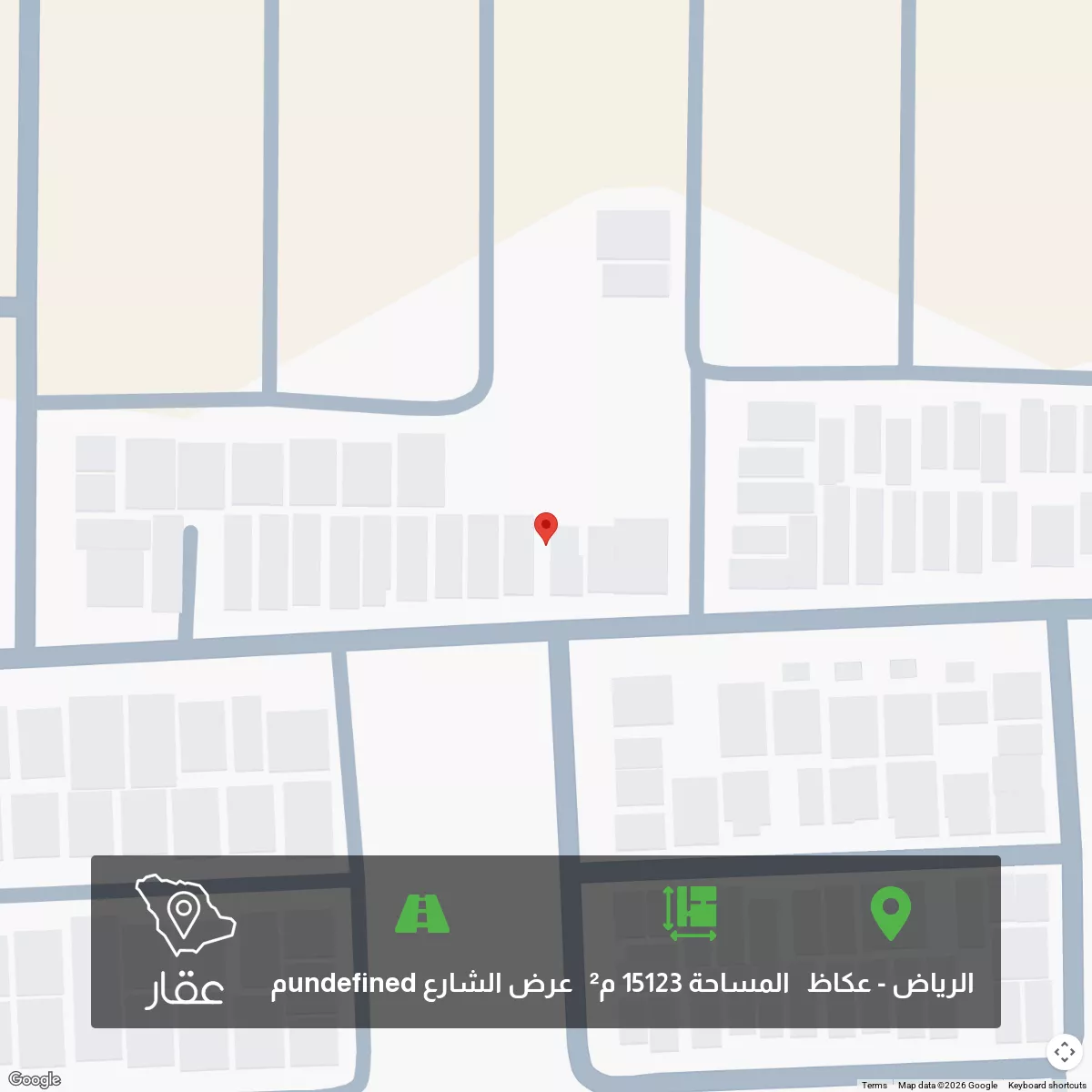 15123 م² أرض في عكاظ، الرياض معروضة بسعر ٣٣٬٢٧٠٬٦٠٠ ريال، أعلى بنسبة 2248% من متوسط سعر الحي البالغ ١٬٤١٧٬٠٠٠ ريال. بناءً على 45 عقار مشابه.