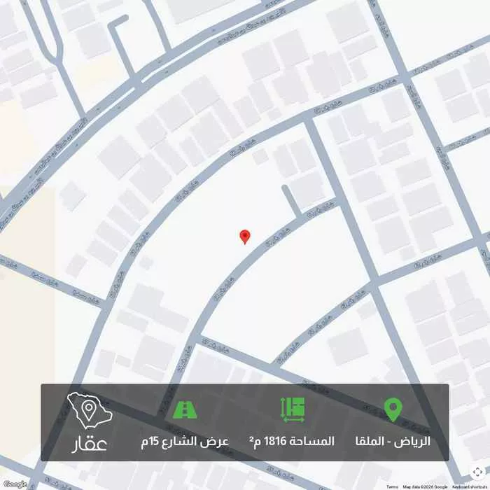 1816 م² أرض في الملقا، الرياض معروضة بسعر ١١٬٠٠٠ ريال، أقل بنسبة 100% من متوسط سعر الحي البالغ ٦٬٦٩٩٬٦٨٠ ريال. بناءً على 119 عقار مشابه.