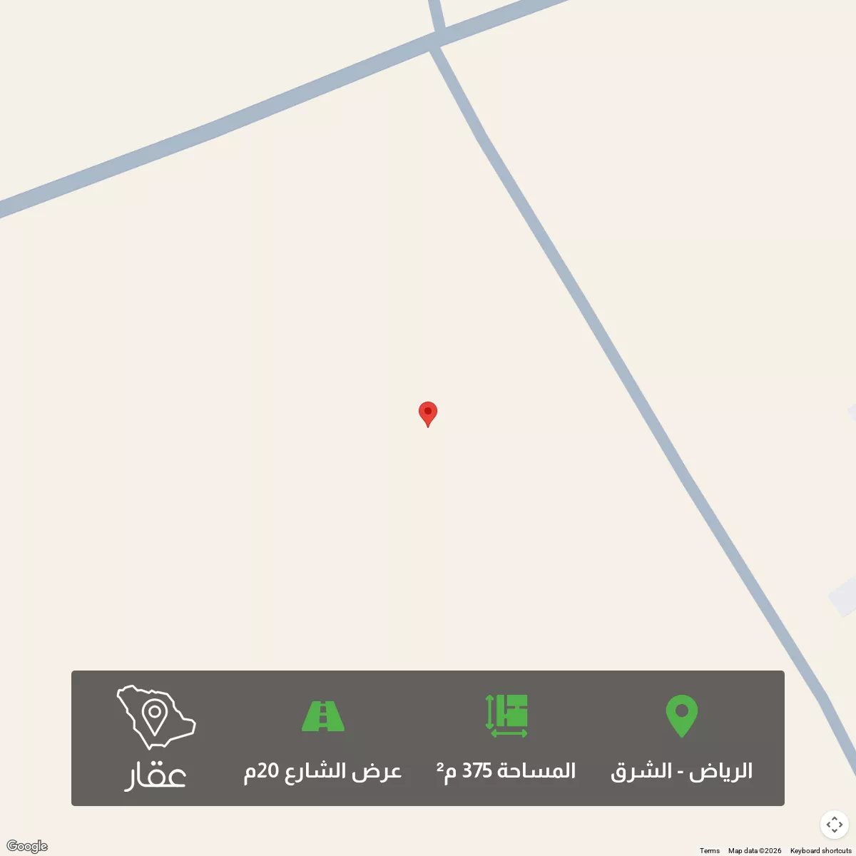 375 م² أرض في الشرق، الرياض معروضة بسعر ٧٨٧٬٥٠٠ ريال، أعلى بنسبة 31% من متوسط سعر الحي البالغ ٥٩٨٬٩٥٠ ريال. بناءً على 650 عقار مشابه.