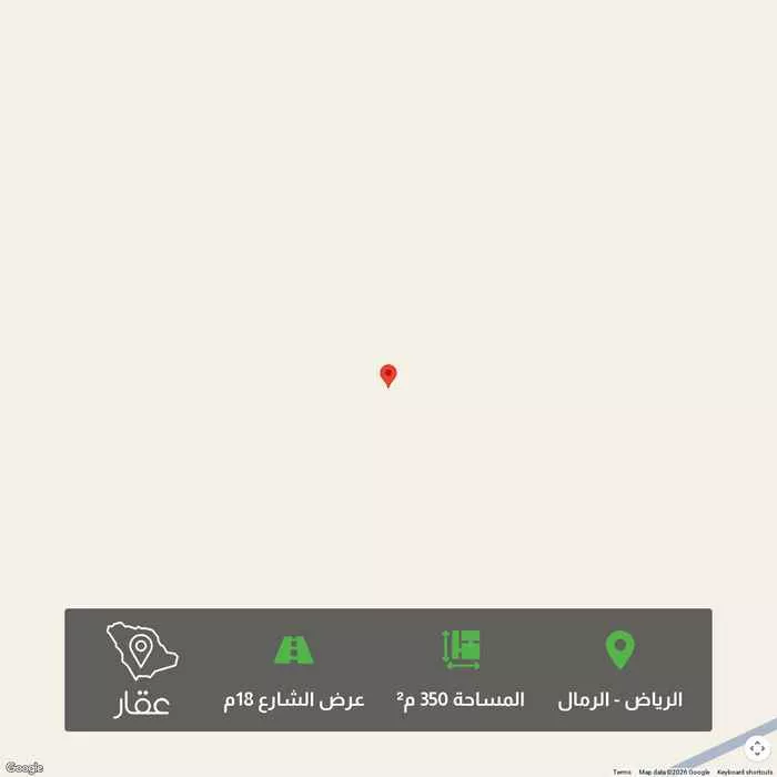350 م² أرض في الرمال، الرياض معروضة بسعر ٥٥٬٢٠٠ ريال، أقل بنسبة 98% من متوسط سعر الحي البالغ ٢٬٤٠٠٬٠٠٠ ريال. بناءً على 270 عقار مشابه.