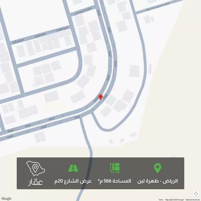 566 م² أرض في ظهرة لبن، الرياض معروضة بسعر ١٬٥٨٤٬٨٠٠ ريال، أقل بنسبة 36% من متوسط سعر الحي البالغ ٢٬٤٧٥٬٠٠٠ ريال. بناءً على 266 عقار مشابه.