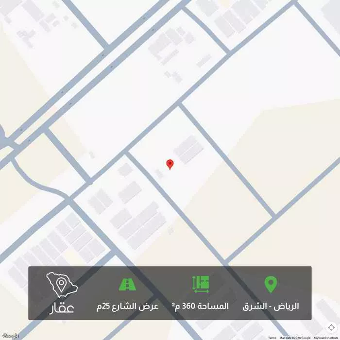 360 م² أرض في الشرق، الرياض معروضة بسعر ١٬٠٨٠٬٠٠٠ ريال، أعلى بنسبة 80% من متوسط سعر الحي البالغ ٥٩٨٬٩٥٠ ريال. بناءً على 650 عقار مشابه.