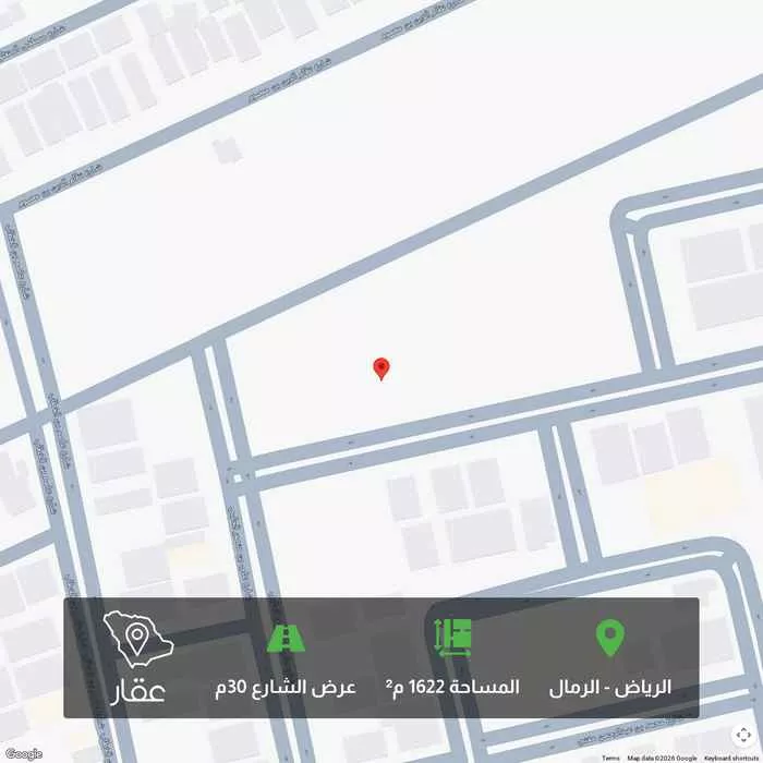1622 م² أرض في الرمال، الرياض معروضة بسعر ٦٬٤٨٩٬١٦٠ ريال، أعلى بنسبة 170% من متوسط سعر الحي البالغ ٢٬٤٠٠٬٠٠٠ ريال. بناءً على 270 عقار مشابه.