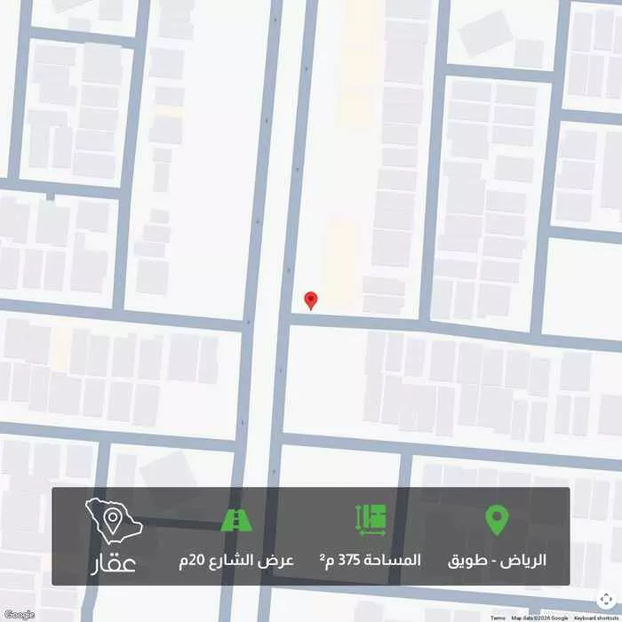 375 م² أرض في طويق، الرياض معروضة بسعر ١٨٬٦٠٠ ريال، أقل بنسبة 99% من متوسط سعر الحي البالغ ٢٬٠٠٠٬٠٠٠ ريال. بناءً على 103 عقار مشابه.