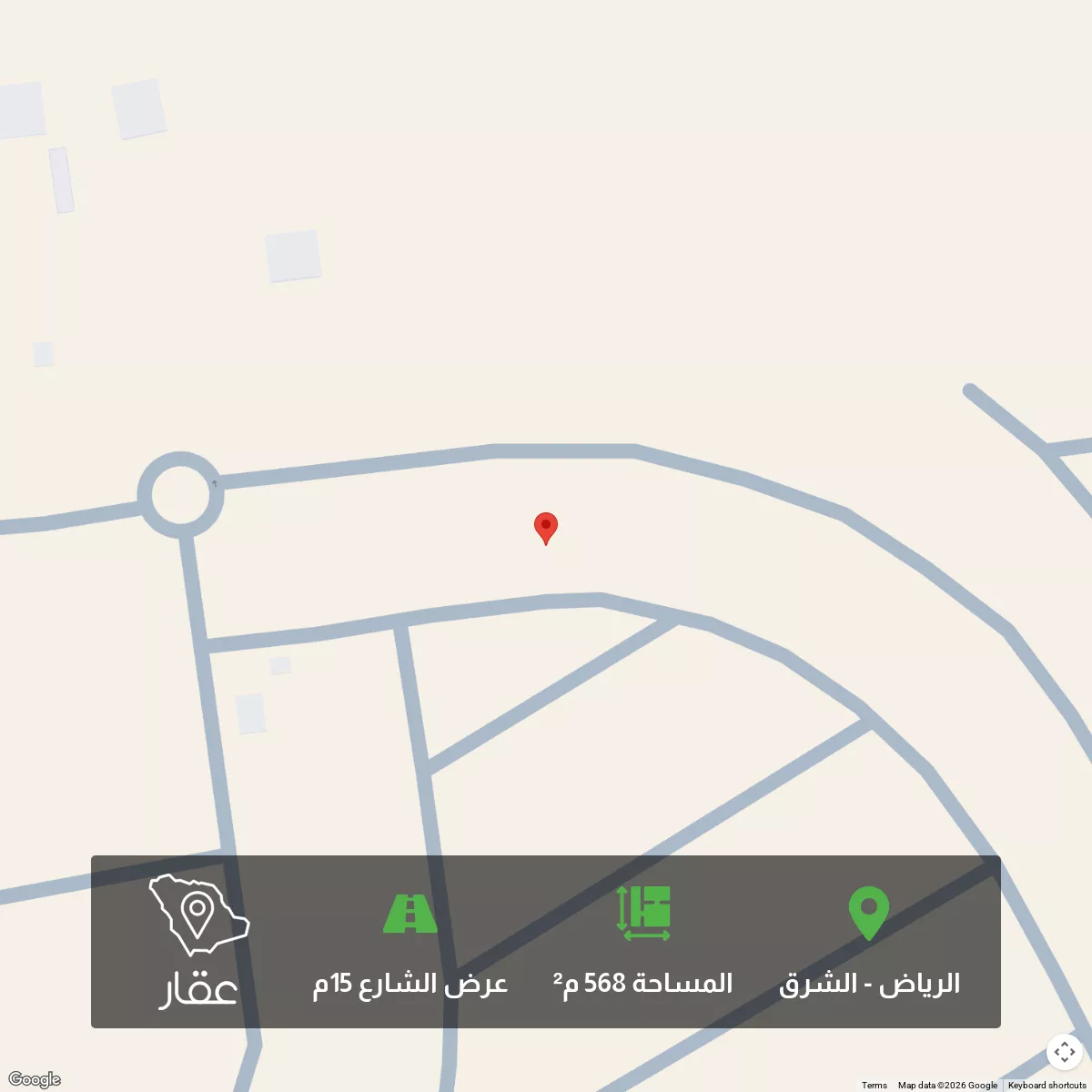 568 م² أرض في الشرق، الرياض معروضة بسعر ٣٠٬٠٠٠ ريال، أقل بنسبة 95% من متوسط سعر الحي البالغ ٥٩٨٬٩٥٠ ريال. بناءً على 648 عقار مشابه.