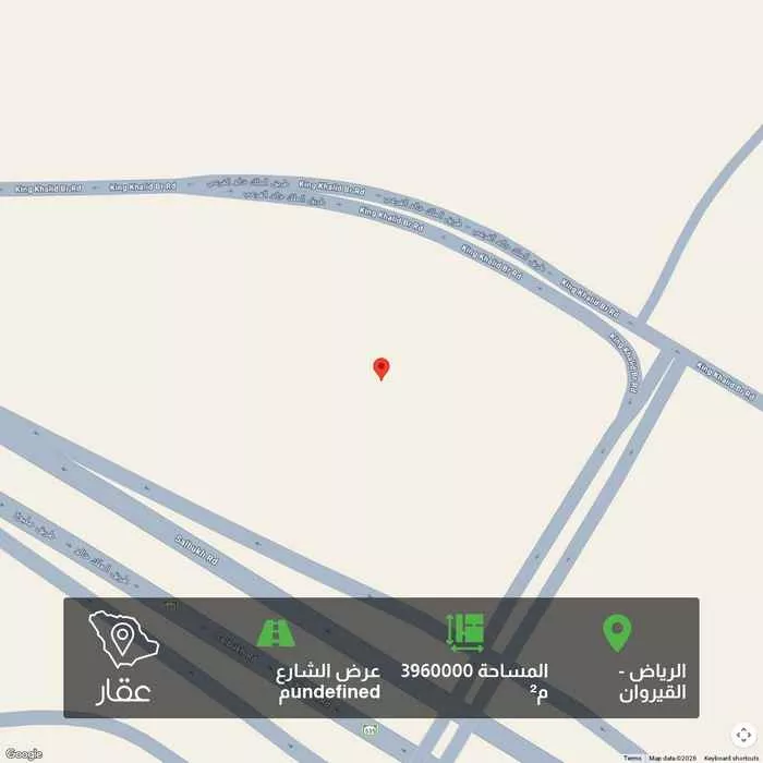 3960000 م² أرض في القيروان، الرياض معروضة بسعر ١٨٬٠٠٠ ريال، أقل بنسبة 99% من متوسط سعر الحي البالغ ٣٬٣٥٧٬٥٠٠ ريال. بناءً على 214 عقار مشابه.