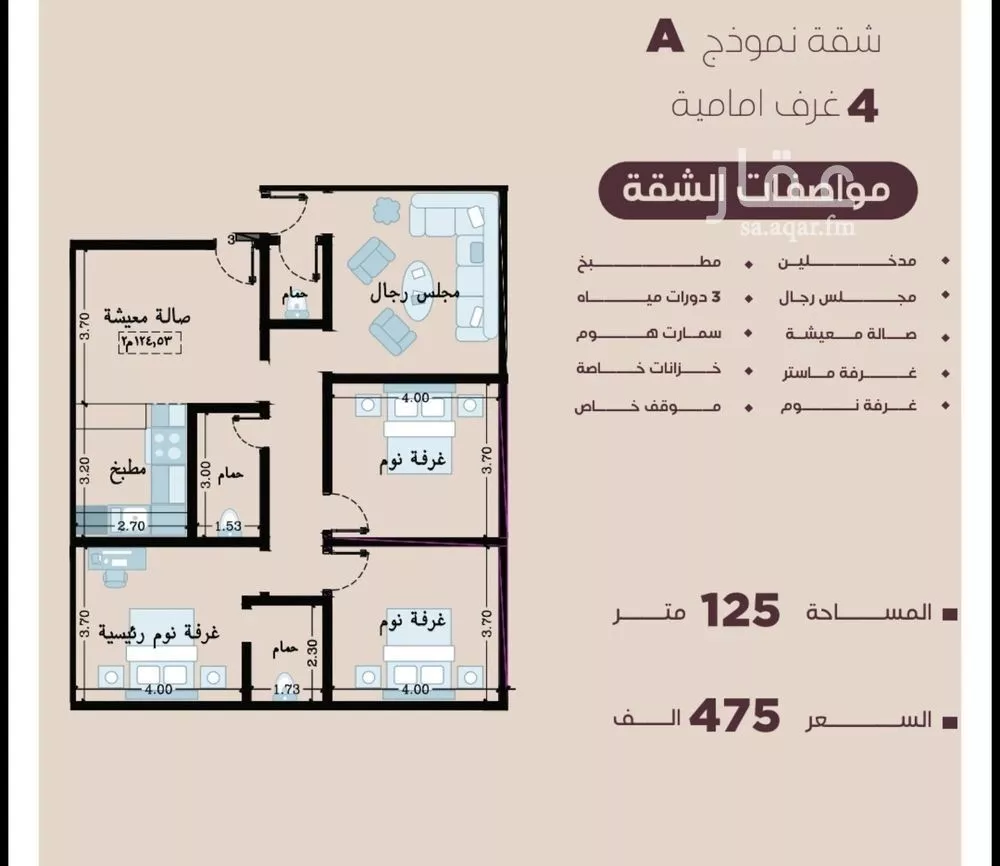 View on Aqarشقة بحي المنار تتكون من : 4 غرف اماميه مدخلين - مطبخ صالة معيشة - ٣ دورات مياه موقف خاص - خزانات مستقله علوي وسفلي المساحة 125م السعر 475000 الدفع كاش مميزات المشروع تشطيب عصري موقع استراتيجي قريب من ...
