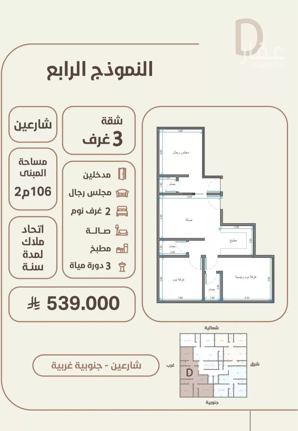 View on Aqarشقة ع شارعين مساحة 106م السعر 539 الف