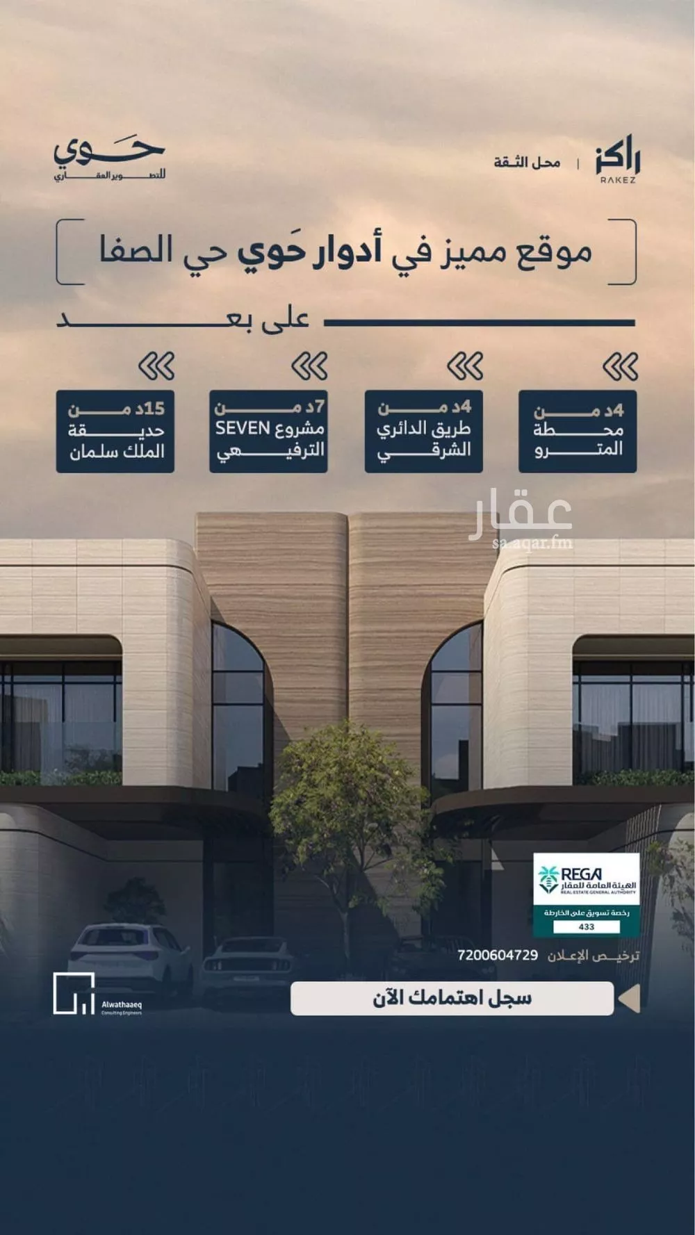 View on Aqarبدأ البيع بنظام البيع على الخارطة على منصة وافي ترخيص رقم : 899 فرصة تتملك دور سكني في قلب الرياض حي الصفا — أدوار حوي المشروع تحت الإنشاء موقع استثنائي وقريب من كل الخدمات مواصفات الدور الأول بمساحة ...