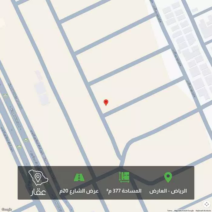 This 377 sqm land in Al Aridh, Riyadh is listed at 2,250,000 SAR, 31% below the neighborhood median of 3,245,824 SAR. Based on 358 comparable listings.