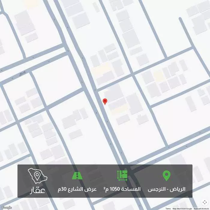 View on Aqarقطعه أرض زاويه تجاريه بحي النرجس الكيلو الرابع الغربي مساحة ١٠٥٠ متر شارع ٣٠ غربي نافذ لطريق الملك سلمان ممر ١٠ شمالي الاطوال ٣٠ * ٣٥ مقام عليها استراحه قديمه البيع ٩٥٠٠ للمتر مباشر مع وكيل المالك