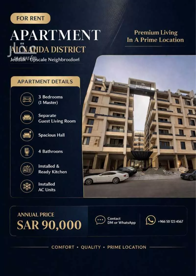 This 3BR apartment in Al Nahda, Jeddah is listed at 90,000 SAR/year, 50% above the neighborhood median of 60,000 SAR. Based on 91 comparable listings.
