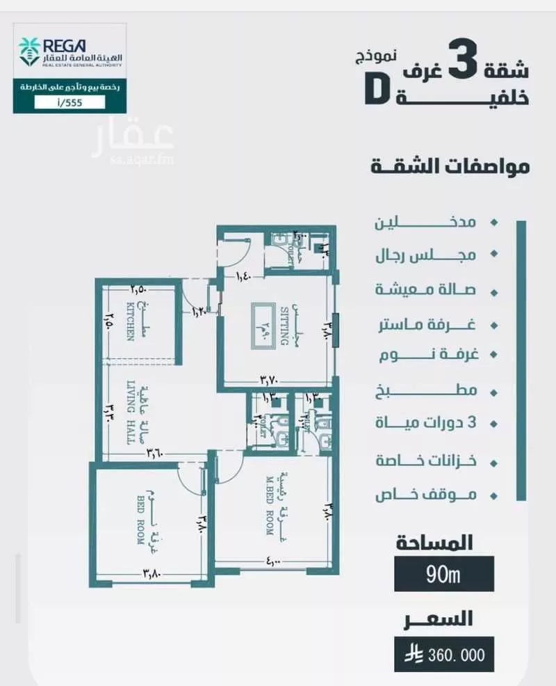 شقة 3 غرف مدخلين مجلس رجال غرفة ماستر غرفة نوم صالة معيشة مطبخ ٣دورة مياة موقف خاص خزانات مستقلة علوي وسفلي عداد كهرباء خاص بمساحة ٩٠م بسعر ٣٦٠ الف فقط ٣ مواصفات المشروع: تشطيب فاخر نظام دخول ذكي (Sma...