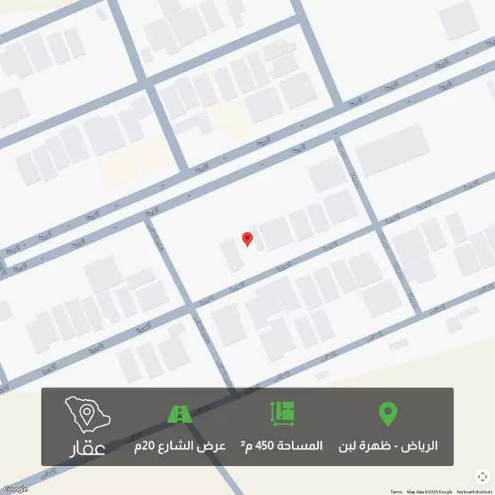 View on Aqarللبيع قطعة ارض سكني حى ظهرة لبن الشرقي المساحة ٤٥٠م شارعها جنوبي ٢٠ م ١٥ م في عمق ٣٠ م الارض علي السوم مباشر من الوكيل