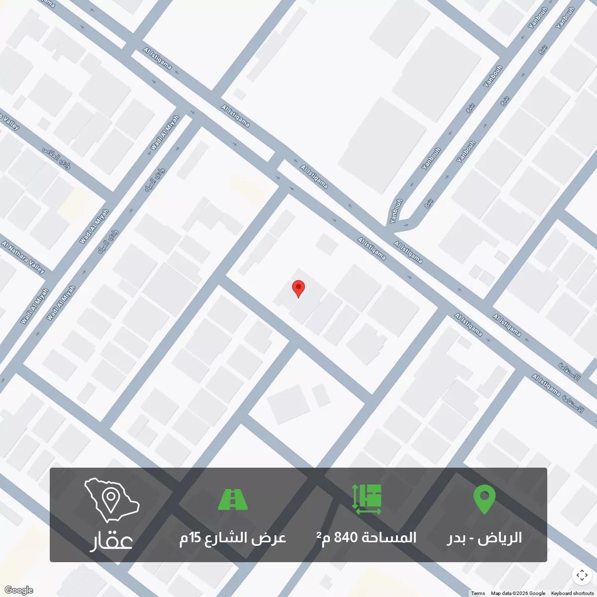 View on Aqarارض للبيع حي بدر سكني قريبة من المسجد مساحة 840 متر على شارع 15 الاطوال 30 *28 للتواصل
