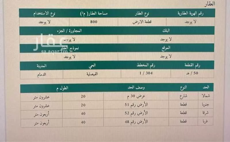 View on Aqarللبيع أرض في حي الفيصلية الجنوبية خلف شركة الخثلان موقع جدا ممتاز على طريق الظهران الجبيل شارعها ٣٠ واجهة شمالية مساحتها ٨٠٠م٢ كما توجد ارض بنفس المنطقه مساحات تبدا من 600 م بالامكان بيع نصف الارض اذا...