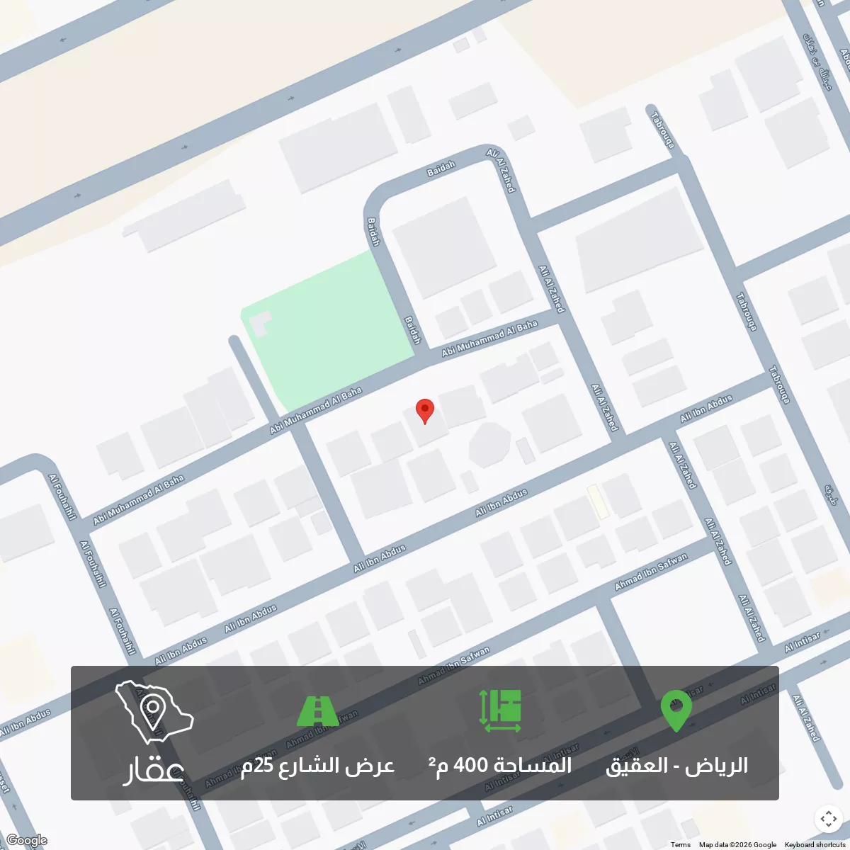 View on Aqarhttps://maps.app.goo.gl/Prp3VZ7wSdYaCfL56?g_st=com.google.maps.preview.copy للبيع فيلا بقيمة ارض – حي العقيق (الرياض) الموقع: مقابل حديقة ومسجد المساحة: 400 م² – الأطوال: 20 م × 20 م الواجهة: شمالية –...