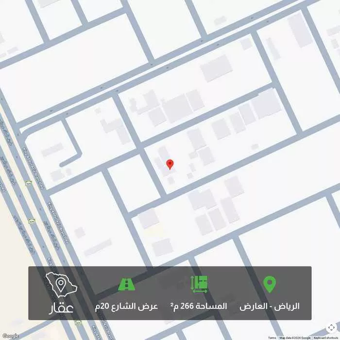 View on Aqarالسلام عليكم .. للبيع ارض بحي العارض م266 شارع 15 غربي. الارض تبعد عند طريق الملك عبدالعزيز 100م. شارع قصير وحي سكني جيد الاطوال: 13*20 سعر البيع مليون و 800 الف شامل السعي