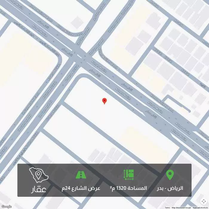 This 1320 sqm land in Badr, Riyadh is listed at 4,620,000 SAR, 230% above the neighborhood median of 1,400,865 SAR. Based on 88 comparable listings.