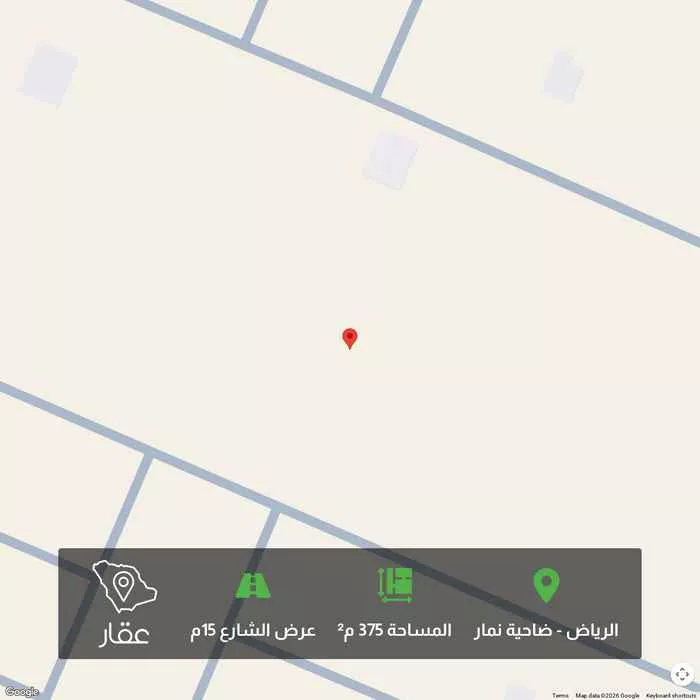 View on Aqarللبيع - أرض سكنية مميزة في ضاحية نمار تفاصيل العقار : ـ الموقع : ضاحية نمار ـ المساحة : 375م2 ـ الواجهة : جنوبية ـ عرض الشارع : 15م ـ السعر : 500.000 ريال مميزات الموقع : ـ حي هادي ومناسب للعوائل ـ مس...