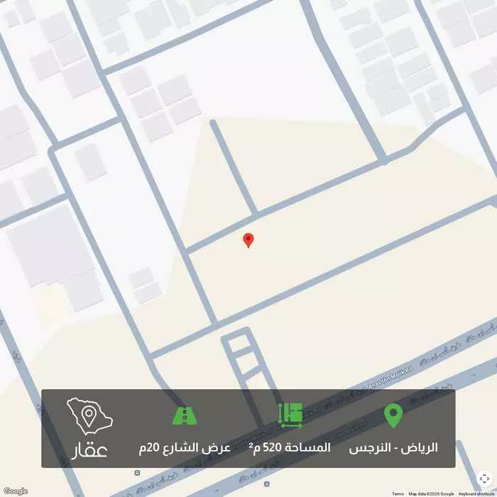 View on Aqarأرض سكنية بحي النرجس موقع مميز شمال أنس بن مالك الأطوال ٢٠م في ٢٦م الشارع: ١٢م شمالي الأرض من ضمن البلك كامل والبيع للجميع مناسب لبناء أدوار أو فلل